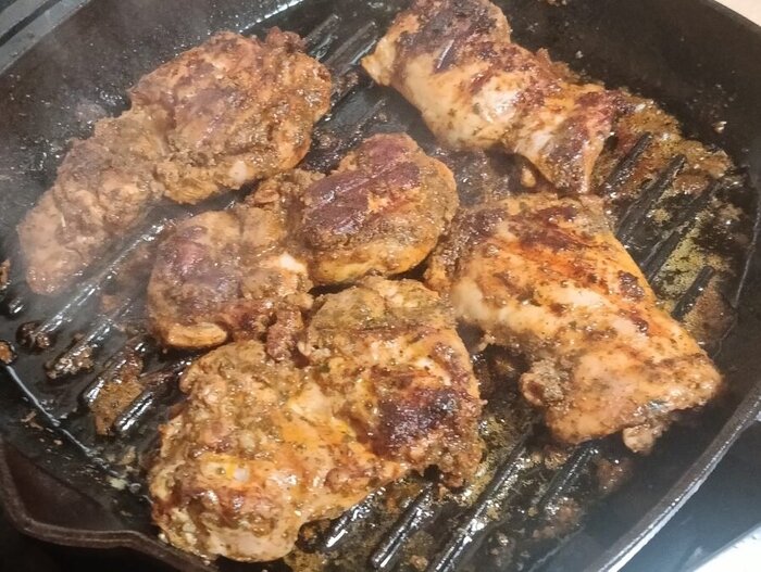 Выньте свинину из маринада и немного промокните бумажными полотенцами (если маринад загустел, разогрейте в микроволновке пакет со свининой 1-2 минуты и только потом вынимайте). Маринад вылейте в сотейник. Разогрейте сковороду гриль и обжарьте вырезку на сильном огне под крышкой 5-6 минут, переверните и жарьте еще 5-6 минут. Затем выключите огонь и оставьте на плите, под крышкой, еще на 5 минут, внутренняя температура 60C-63C. Дайте постоять 5-10 минут и нарежьте.