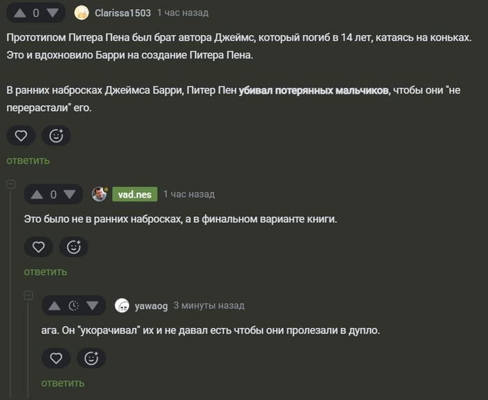 Но даже тогда, в тот первый день, что-то было не так. Феи кусались, когда думали, что никто не видит. Русалки, смеясь, показывали слишком острые зубы. А "потерянные мальчики" смотрели на Питера не с восхищением, а с дрожью.