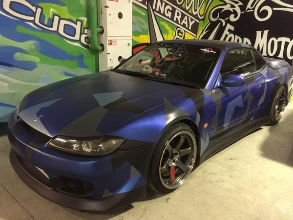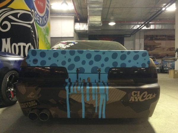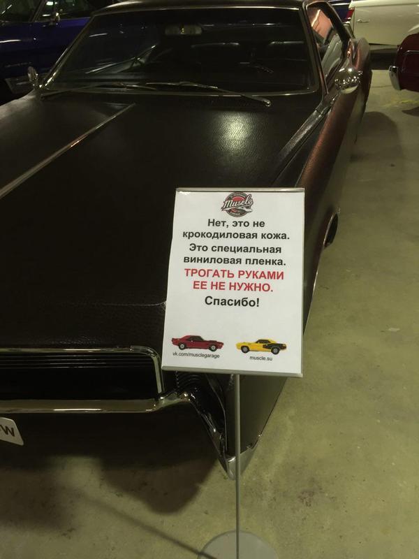 А этот автомобиль привлекал внимание благодаря своему необычному покрытию. С виду кажется, что машина обтянута крокодиловой кожей, но это совсем не так, об этом даже гласит табличка: