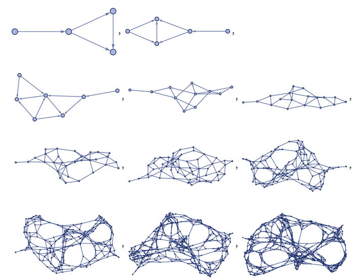 Пример Вольфрама вычислительной эволюции графа по простому правилу преобразования