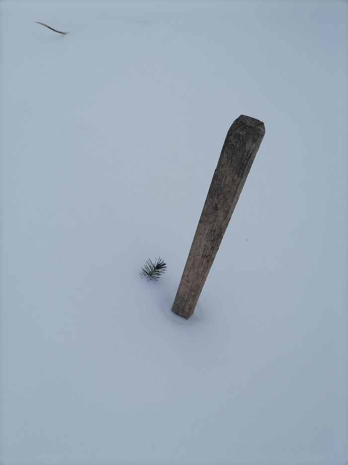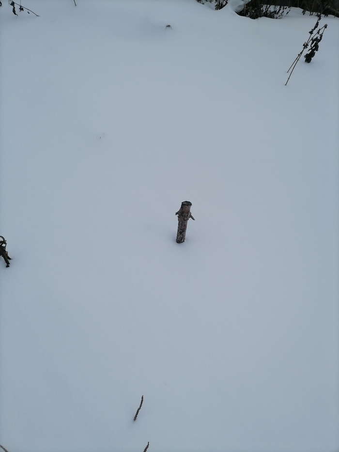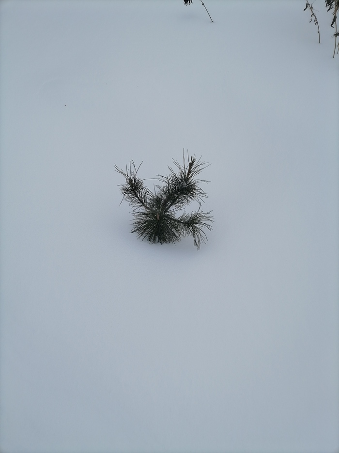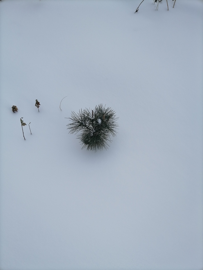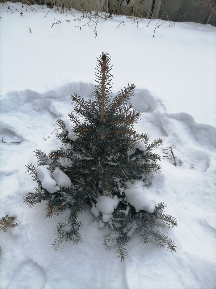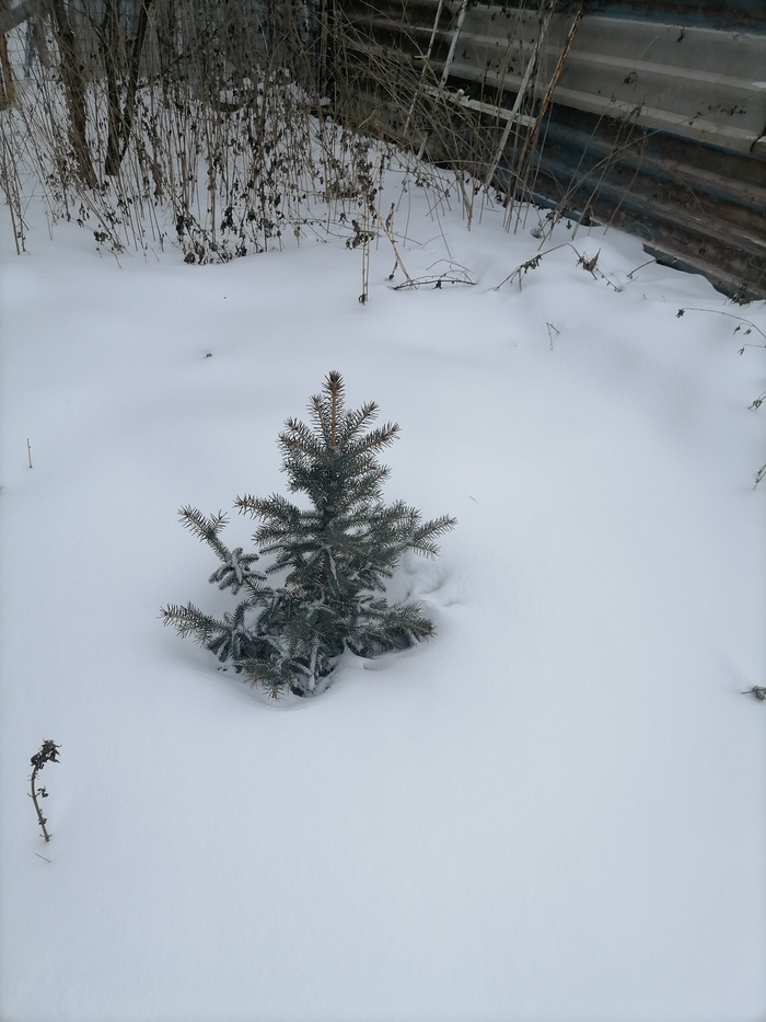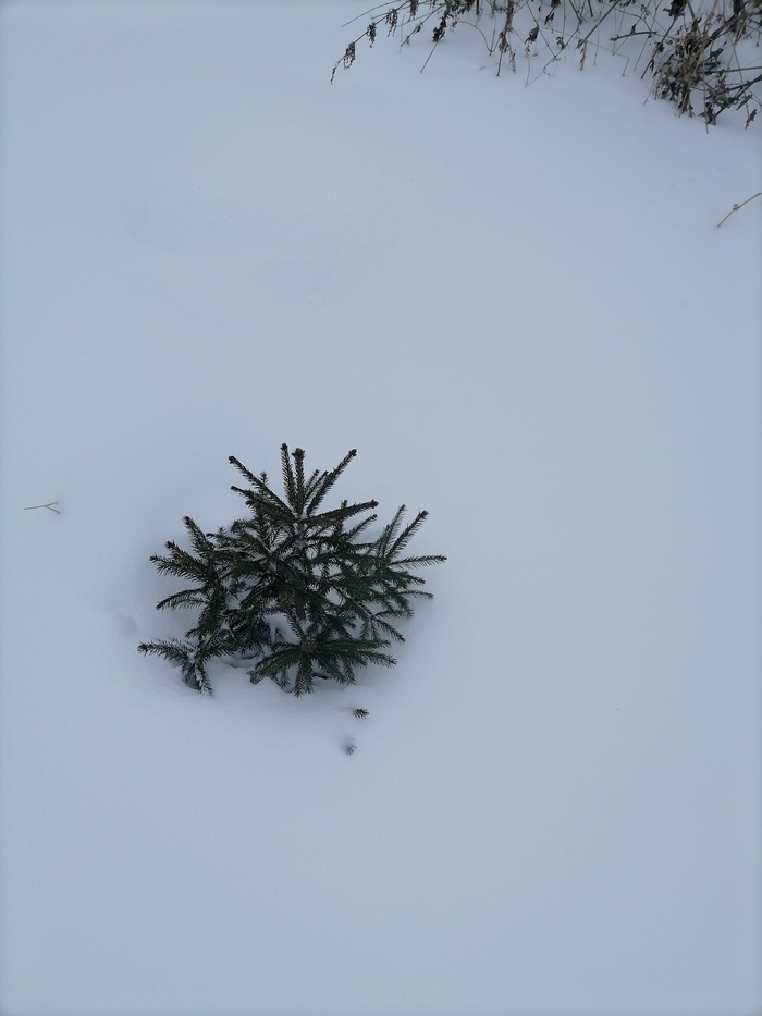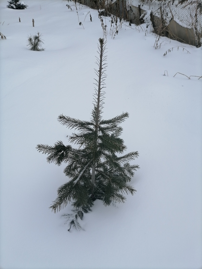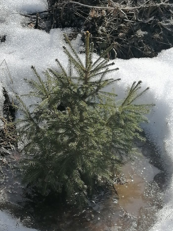 Теперь по порядку. Обычная зеленая ель. При пересадке сильно повредил корень. Прижилась. Но сил на рост маловато. Снега в этом году немного - сантиметров 20-25. Едва торчит верхушка.