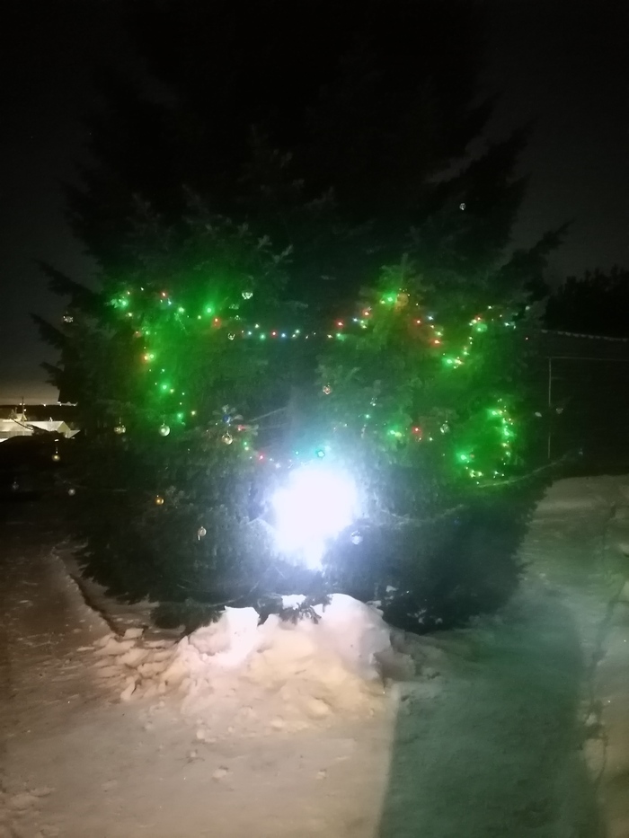 Бонусом. 30-35 летняя пихта. Растет на участке с 1996 года. Украшаем ежегодно. Лапами уже дорожки перекрыла. Дневные фотографии её есть в лиге любителей хвойных и в серии постов.