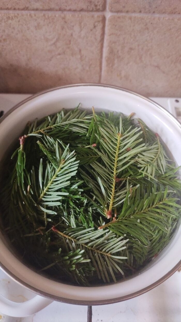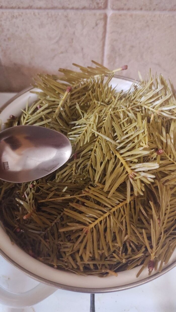 Вот вам пример как выглядит сироп в готовом варианте. Сразу хочу отметить что цвет может сильно варьироваться от золотистого до розового. Тут все легко и просто - чем больше хвои и меньше сахара, тем более розовый цвет мы получаем. И в обратных пропорциях мы будем приближаться к золотому(медовому) цвету. Лично мне очень нравиться именно вариант "розового сиропа", но в примере оказалась небольшая порция и пришлось сделать ее более насыщенную сахарами. Сам по себе сироп употребляю во время различных простудных заболеваний и как профилактика. Но честно сказать розовый вариант настолько вкусный что у меня улетает как в черную дыру. Итак давайте перейдем непосредственно к рецепту. Для начала нам надо набрать свежих побегов ели или пихты. Чем больше вы наберёте тем лучше. Сам сироп включает в себя всего 3 ингредиента - Побеги, Вода, Сахар.