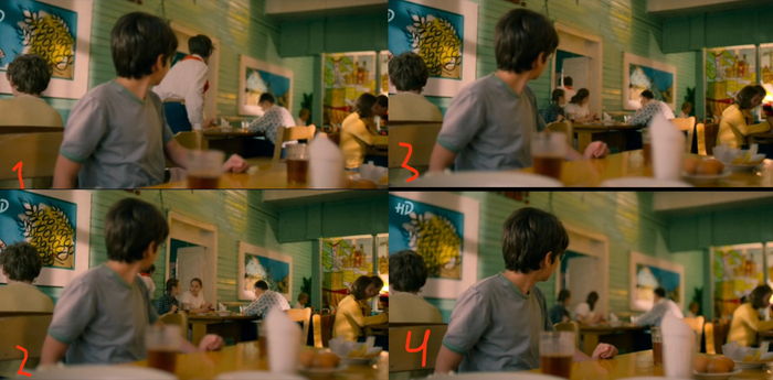 "-Как дела? -Нормально. -Ну чего? -Ничего. -Морженое будешь? -Буду. Оба молчат минуту. Потом едет машина по дороге, где то минуту. А потом плавают в море минуты 3"