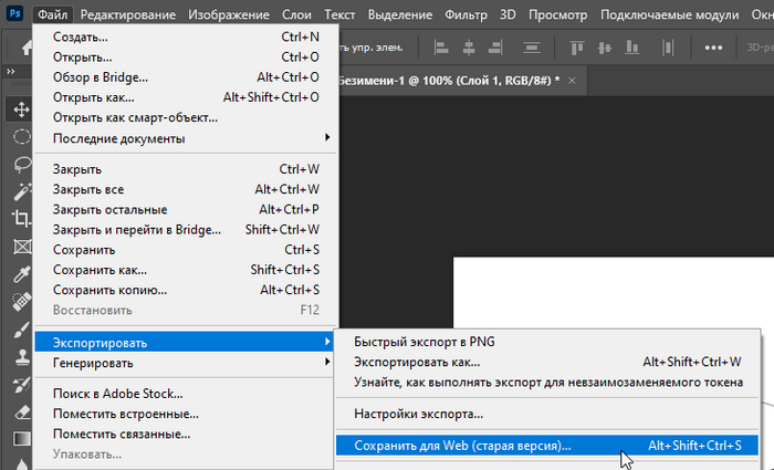 6. В верхнем меню выбираем пункт - "Файл" - "Экспортировать" - "Сохранить для Web".