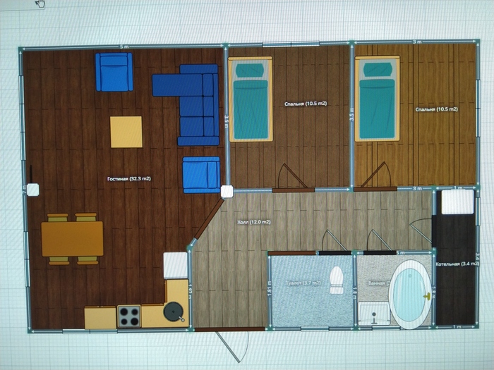 А, да. Общая площадь выходит около 100м3. Стены показаны схематично, так что она в любом случае изменится. Думаю, выйдет чуть меньше 100.