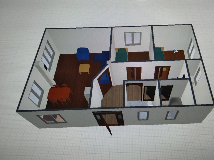 Остальное плюс-минус очевидно. Комнаты небольшие, но детские расширятся засчет двухъярусных кроватей (которые со столом снизу), а спальня большая не нужна. Правда, пока писал эти комменты, понял, что не вокнул нормальный шкаф для одежды. Мб чуть подвину детскую и закажу шкаф чуть поуже, но во всю стену.