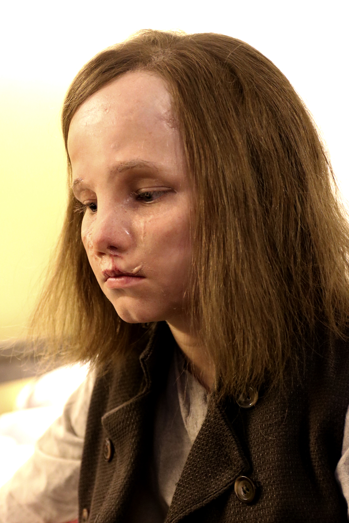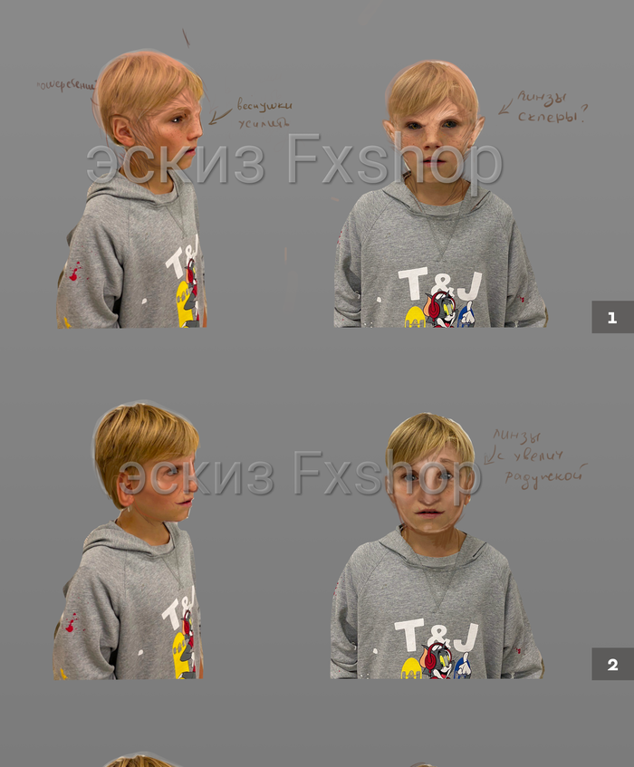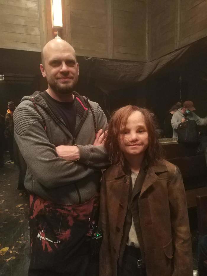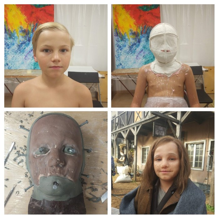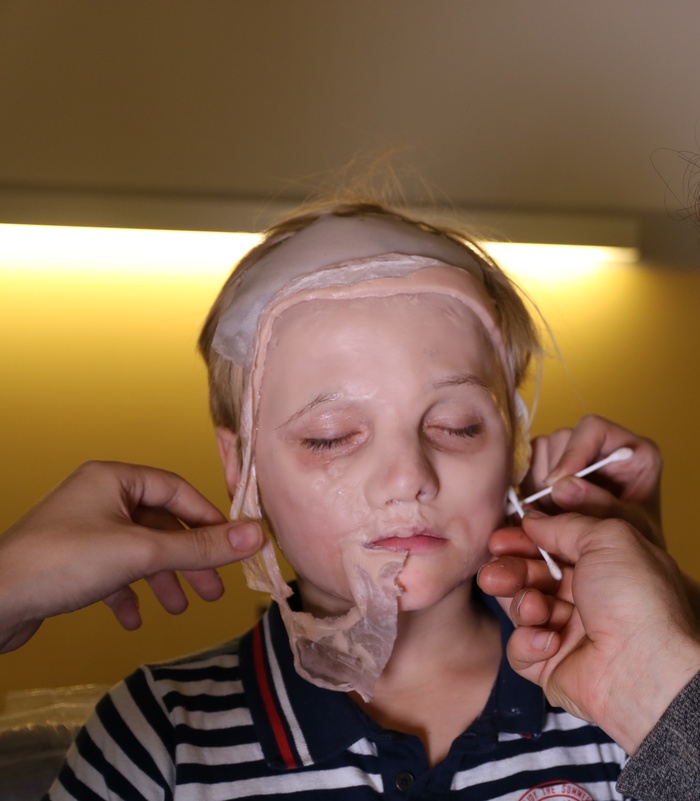 При подготовке делали несколько тестов, что бы и режиссер видел результат, и ребенок-актер в комфортной обстановке понял, что его ждёт. А ждало его три дня съёмок, с гримом на все лицо. Грим занимал в четыре руки по три часа в день. Важно: грим надо делать при том освещении, при котором будут снимать. Если свет на площадке будет лютый, то надо периодически выходить и проверять как смотрится. При разном освещении и разной камере пластический грим будет выглядеть по-разному, смотрите через камеру. Это один из важнейших постулатов в работе с пластикой. Есть второй, но о нем позже.