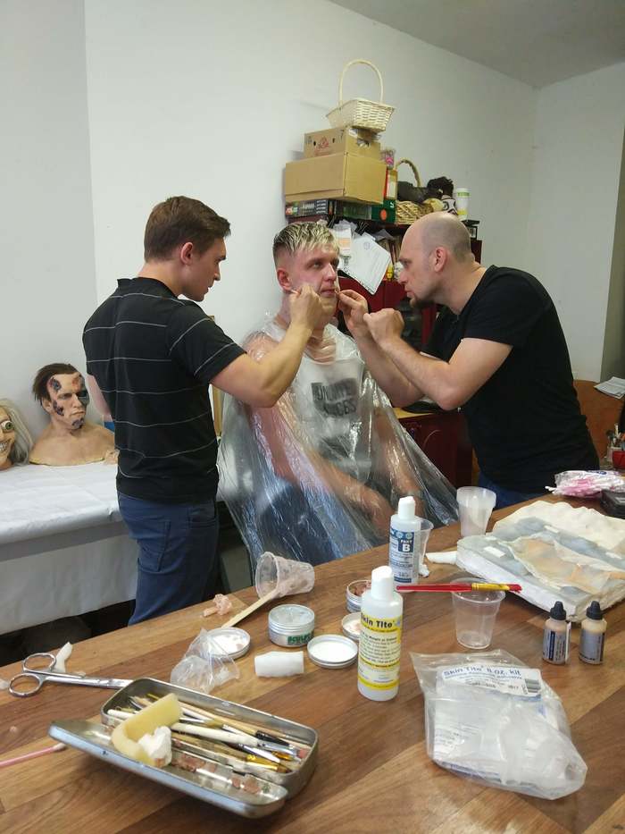 Грим по классике силиконовый с тонким краем. Толщина самой детали довольно существенна и весит она около полутора кг, тяжко такой вес на шее таскать и актеру и детали. Поэтому в лепке Денис проявил хитрость - деталь увеличивает всю окружность шеи. Одевается через голову Удобный это вариант лепки в том, что вес распределяется равномерно, нагрузки на щечные края детали минимальны. А значит, что держаться она будет изо всех сил долго. Съёмочный день по классике 12-18часов, время на грим - 3-4 часа.