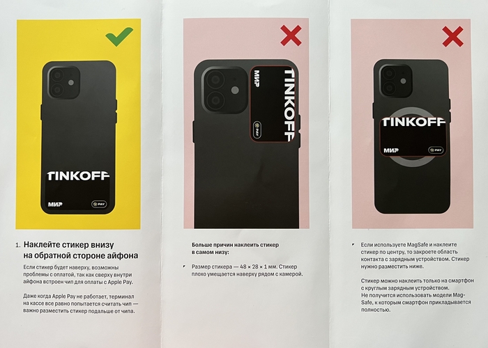 Второе разочарование - это невозможность наклеить платёжный стикер на любую часть телефона. В инструкции конкретно указано, что стикер должен находиться снизу. Иначе он будет конфликтовать с NFC модулем телефона:
