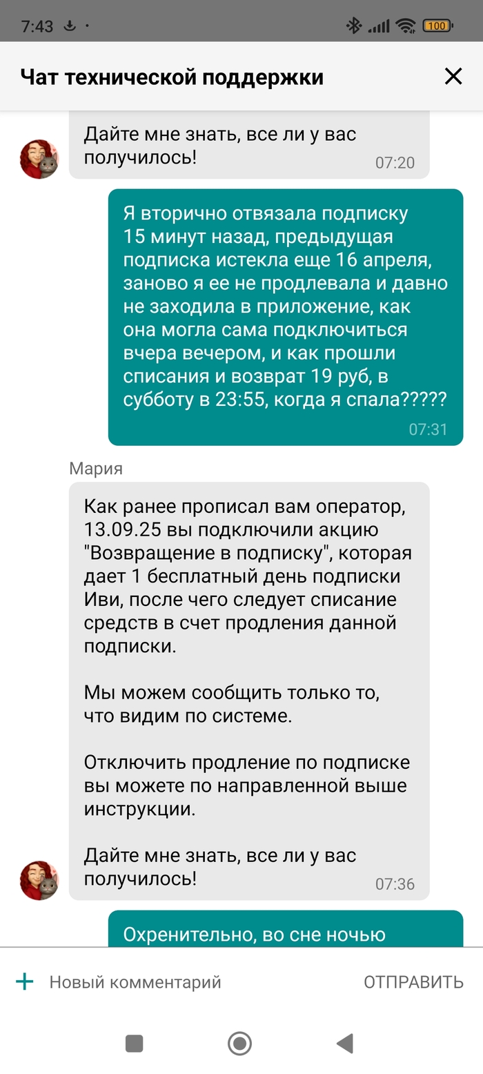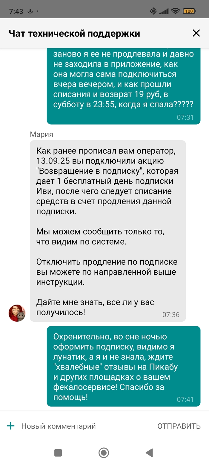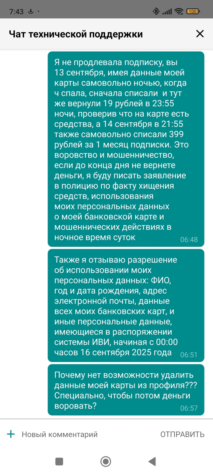 В субботу 13.09.2025 года в 23:55 ночи, пока я спала, сервис Иви сделал списание и возврат суммы в 19 руб., проверив тем самым, что деньги на карте есть и она действующая.