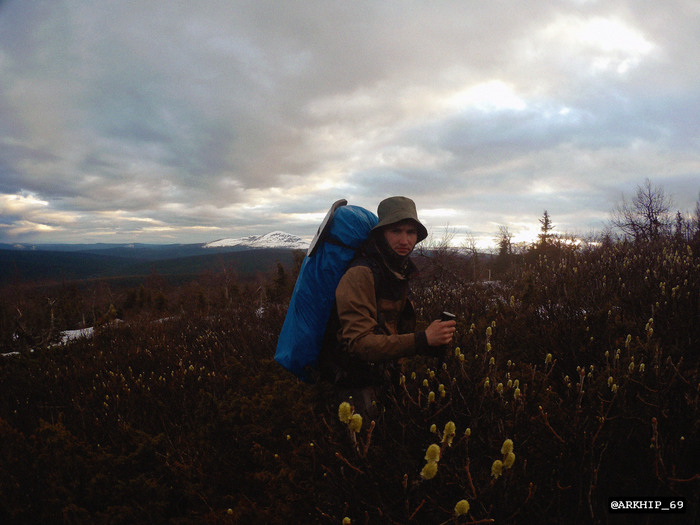 ➡6 день день. Дорога домой. Изначально мы планировали на сегодня 31 км, но вчера мы сэкономили один день и топить нам ненужно, мы выспались. Спокойной собирались, пока Иван и Олеся готовили завтрак мы с Дэном сбегали до истока р. Печора за водой и просто увидеть это место. Позавтракав мы потихоньку потопали, тем же путем до Европы Азии. Надо отметить, что болото за два дня изрядно подсохло, дождей с тех пор как мы шли не было. Но стало гораздо больше следов медведей, так что мы шли издавая разные громкие звуки, пели песни и стучали в кружи. И уже идя с пупов я приметил одну гору под названием Койп, котора стояла особняком и выглядела очень статно. Гора которая следила за нами до самого Перевала Дятлова, на обратной дороге. Дойдя до модулей, мы обнаружили что родник пересох и это было печально, воды набрали совсем мало, хватило только на еду.