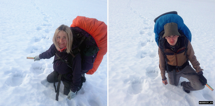 Наш запас еды быстро оскуднел за последние дни, мы стали было недоедать, благодаря недавнему обжорству под перевалом… далее ближе к 3 часам ночи нас стало засыпать снегом, в этот штурм погода решила сыграть с нами в злую шутку…