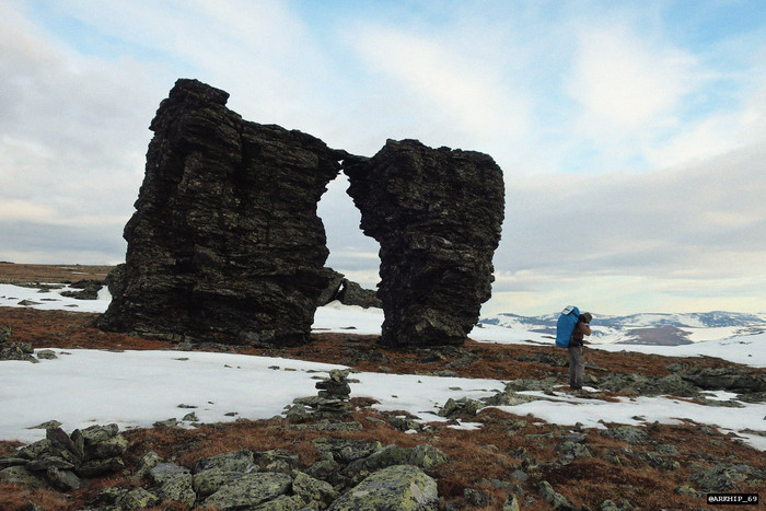 Оставшуюся вторую половину мы преодолевали небольшой подъем на немало известную гору Отортен, к которой в своё время направлялась группа Дятлова. Наверху из камней торчат черные скальные останцы, самое известное из которых ворота Отортена - арка высотой 7 метров.