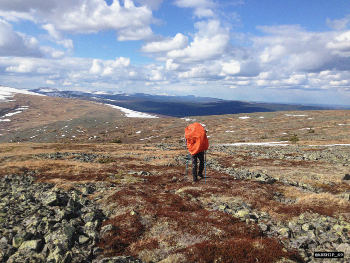 ➡День седьмой. Сегодня нам предстояло пройти длинный путь, с несколькими затяжными перевалами и конечной точной было озеро Лунтхусаптур. Довольно быстро мы дотопали до модулей Щебенка, откопали наш схрон и если честно немного волновались, инспектора сказали что там много медведей ходит и мы опосались как бы он не дербанул наши вещи, могли остаться без еды. Но все обошлось, пришли разобрали вещи, немного поднагрузившись и пошли дальше, прошли мимо Дома Олега, без тумана он не выглядел сурово, а напоминал простой сарай, от него вдали виднелся Моттевчахль и Отортен и как раз между ними мы и пошли, там нас ждало чистейшее горное озеро. И то и дело мы оборачивались, а Койп продолжал следить за нами. Облаков почти не было и когда мы поднимались чуть выше вдали виднелись и сами Каменные Великаны. И даже не верилось, что мы были так далеко.