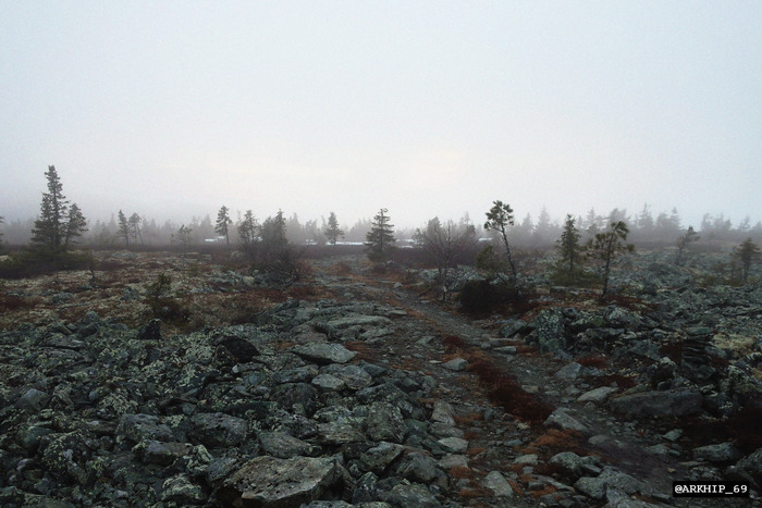 На третий день мы выдвинулись с опозданием, костер долго нас не отпускал. В итоге наш шаговый день начался в 12:00. Поднялись на Перевал и стало понятно, что вчера туман был не такой густой. Если вечером от Скалы Дятлова был виден каменный город, то сегодня было видно ровно ничего...🙄