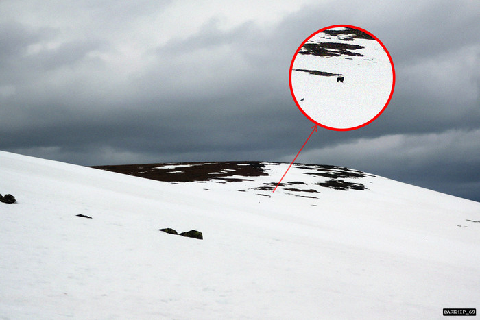 👉 И вот, после очередного подъёма, перед нами показалось озеро, находившеесе будто в кратере вулкана или в воронке от метеорита, по краям скальника лежал снег, а заходящее солнце придавала особый блеск всей этой красоте. Начали спуск и кругом было очень много троп, нахоженных медведями, ведь на Отортене живёт медведица с двумя медвежатами.