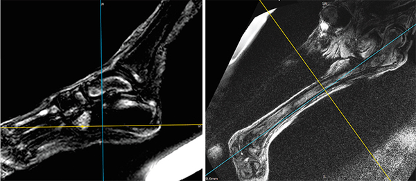 Томограммы костей и суставов левой нижней конечности – субхондральные диффузные отечно-эррозивные изменения суставного хряща головки бедренной кости.В дистальной части диафизарной полости левой бедренной кости (справа) – отечно-склеротические очаги; в патоморфологическом плане эти изменения более всего соответствуют остеосклеротическим последствиям остеомиелитического процесса в подостро-хронической фазе. Изменения левого коленного сустава укладывается в МР-картину дегенеративно-дистрофических изменений с низкоэнергетическими отеками по типу остеоартрита. В костях левой стопы (слева) – очаги с отечной периферией и с МР-плотными (темными) центральными зонами, интерпретированные нами ранее как проявления онкологического метастатического процесса (Letyagin et al., 2014) в сочетании с дегенеративно-дистрофическими изменениями по типу остеоартрита с низкоэнергетическими отеками