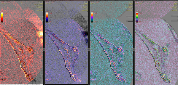 В костях левой стопы – очаги, интерпретированные нами ранее как проявления онкологического метастатического процесса (Letyagin et al., 2014). Очаги выделены с использованием псевдоцветового картирования интенсивности МРТ-сигнала