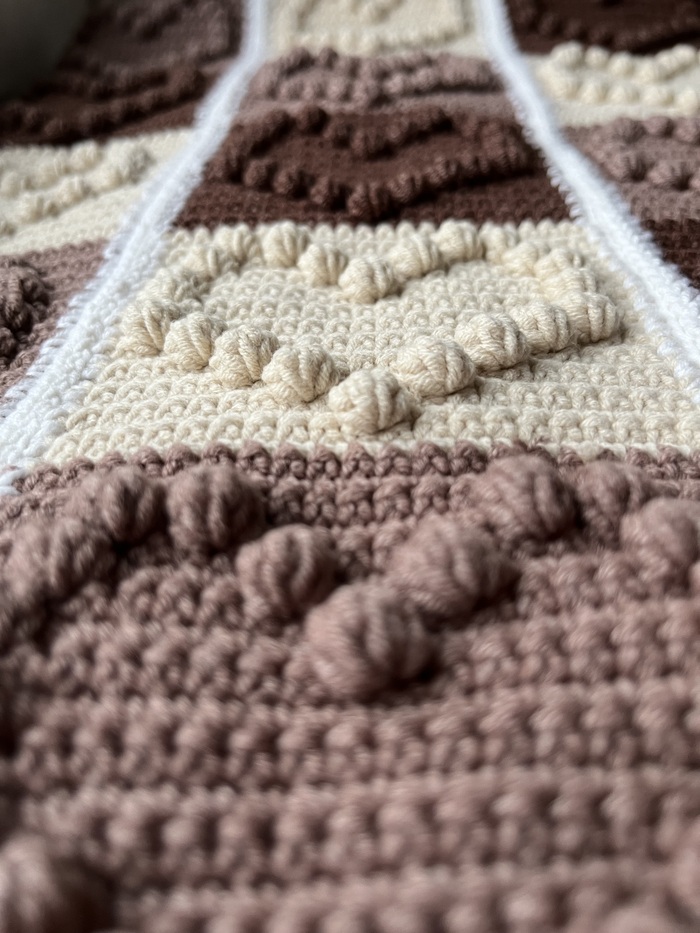 Плед получился ~105х95, крючок 3,5, пряжа YarnArt Jeans. Около 5 мотков ушло (темно-коричневый ушел весь, светло-коричневый и беж ушли 4 мотка. +для обвязки добавляла чисто белый, ушло полтора мотка)