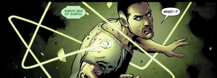 Разумеется, Саймона находят, арестовывают и начинают допрашивать. А он и отвертеться не может. Ну то есть, может, но его отмазки выглядят нелепо. Выходец из исламской страны (вон, даже татуха вязью арабской на руке есть...хотя мусульманам вроде ж нельзя) замечен за рулём автомобиля с бомбой – но утверждает, что не является террористом! Ну не бред ли? Раз мистер Баз отказывается признаваться добровольно, признание из него придётся выбить. Саймону на голову надевают пакет и пытаются привязать парня к столу. А тот отбивается – до тех пор, пока ему не начинают грозить пистолетом. ВНЕЗАПНО в помещение влетает глючащее зелёное кольцо (объединившиеся кольца покойных Хэла Джордана и Синестро) и надевается на палец Саймону. Саймон сначала фигеет, а затем кое-как использует кольцо, чтобы сбежать. Вскоре о новом Зелёном Фонаре узнают Бэтмэн и Киборг и планируют его найти и допросить. А Хэл Джордан и Синестро приходят в себя в измерении тьмы. Они вроде и живы – но можно ли утверждать об этом с уверенностью, когда вокруг сплошная смерть? Продолжение следует!