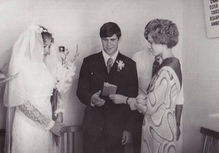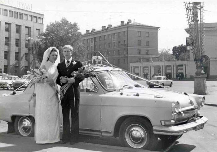 Фотки ещё остались, повезло!) У моих родителей на свадьбе фотографом был друг семьи, по счастливой случайности у дядь Саши оказался отличный фотоаппарат, который он привёз себе с морей, да и как фотограф он был хорош, увлекался этим делом серьезно, только водочку рано начали пить, он сделал кучу отличных кадров, только вот пленку забыл вставить и фотографий всего получилось две и то, которые снял батин друг возле загса!)) Сейчас, конечно, со смехом вспоминают, но думаю осадочек остался))
