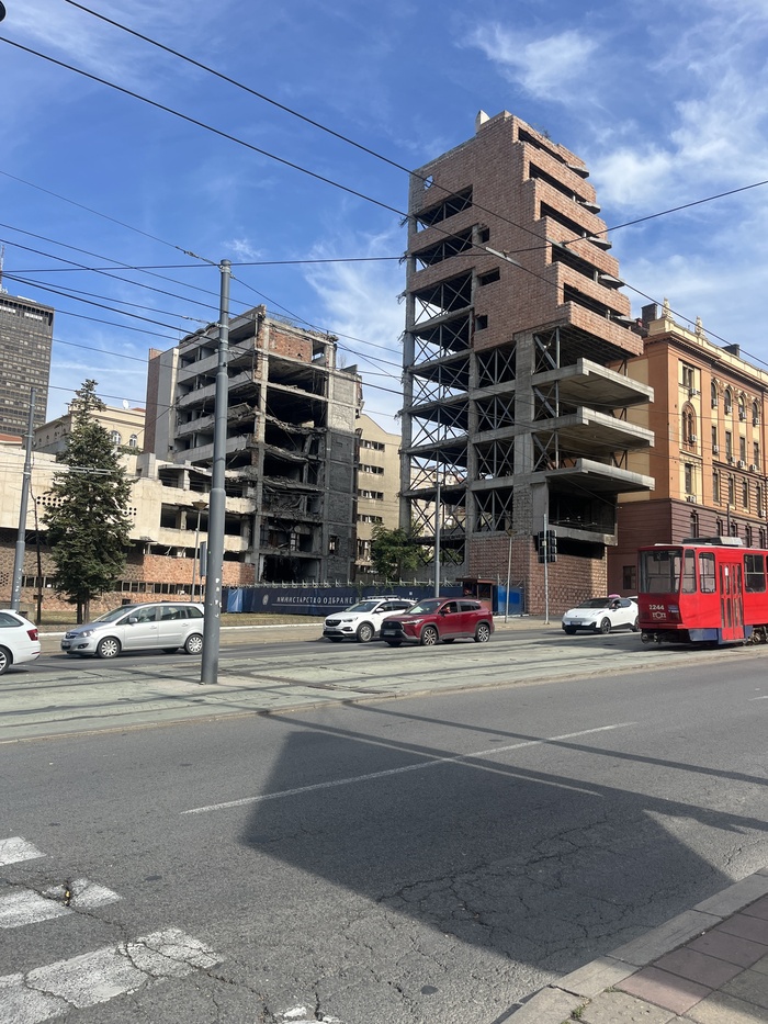 Перед футболом еще посетили разрушенное здание Генштаба вооруженных сил, которое является не только охраняемым памятником архитектуры, но и сознательно сохраняемым в центре города напоминанием о бомбардировках Югославии силами НАТО