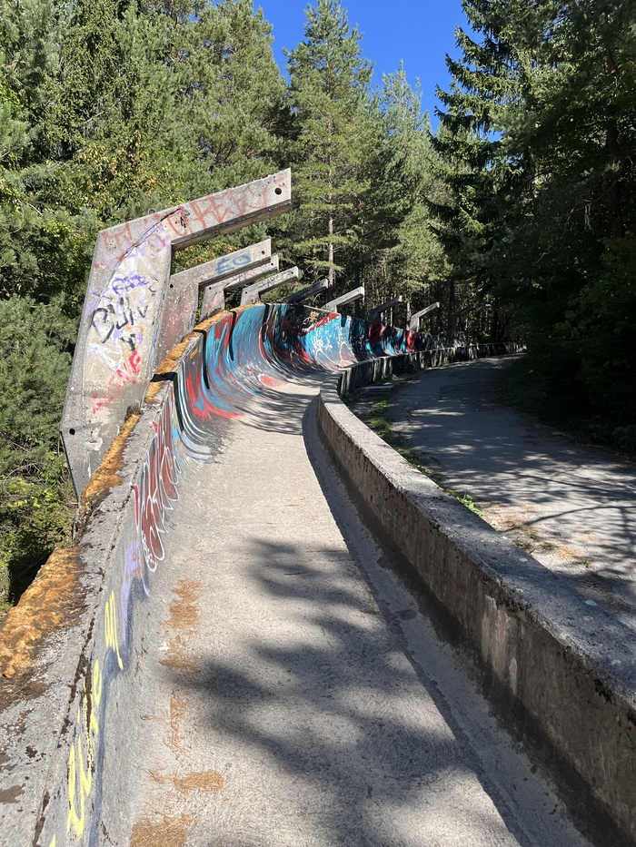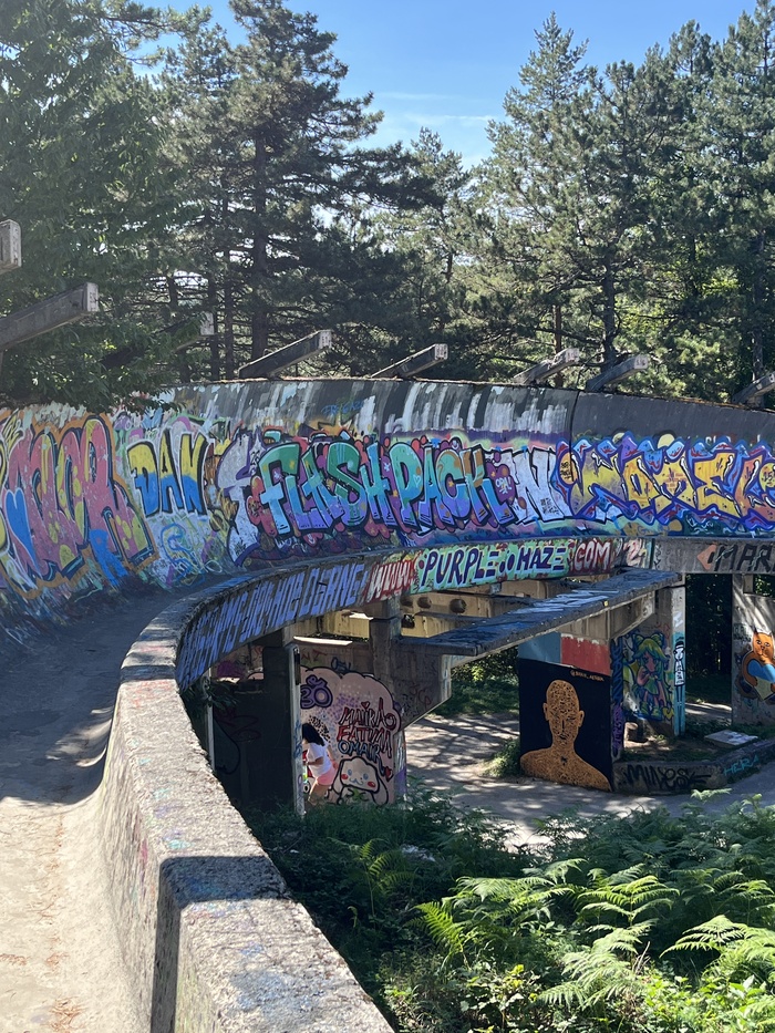 А дальше поехали на заброшенную бобслейную трассу, построенную к Олимпийским играм 1984 года. Сейчас это огромный арт объект на склоне горы.