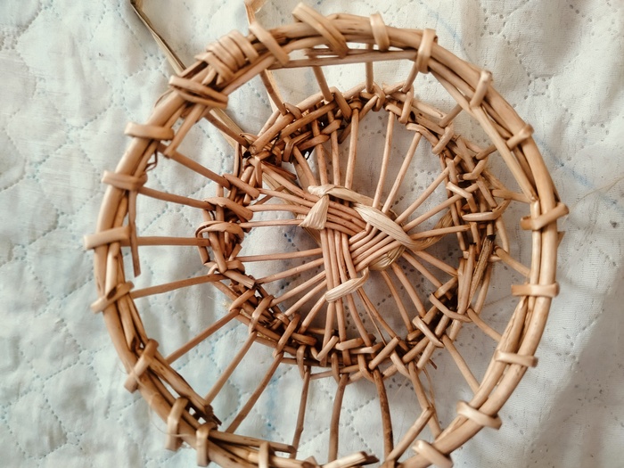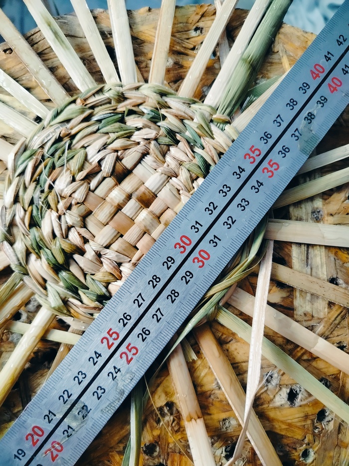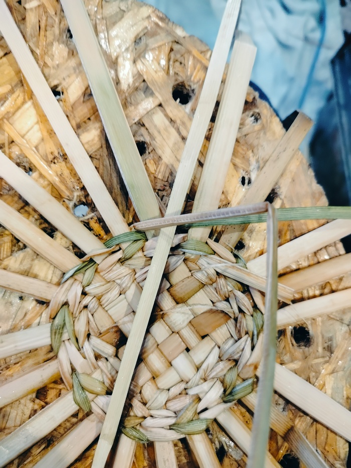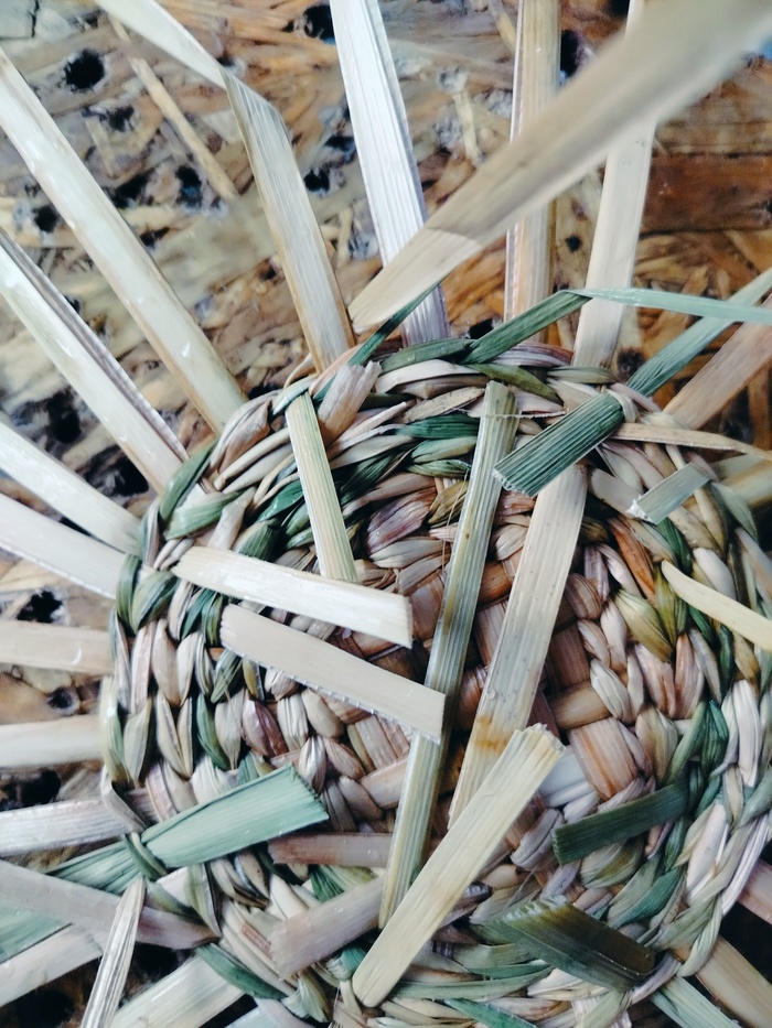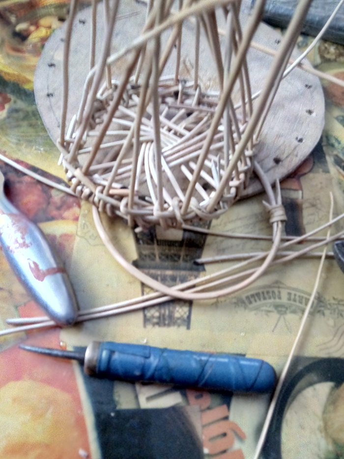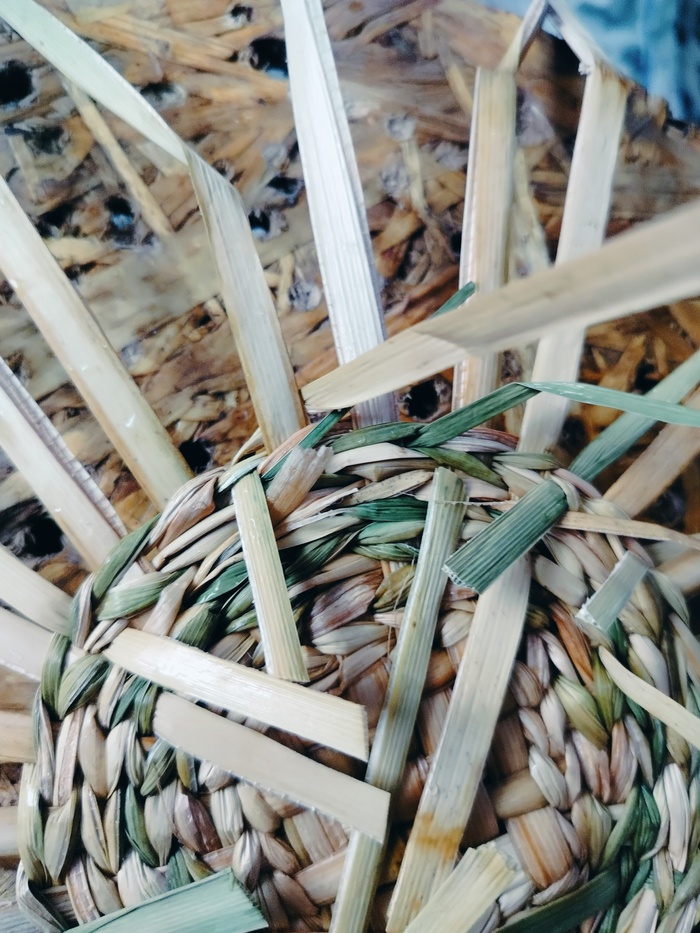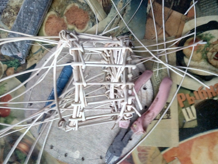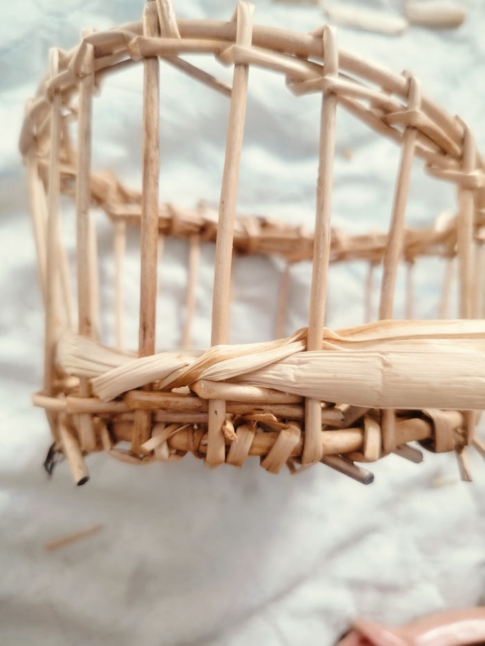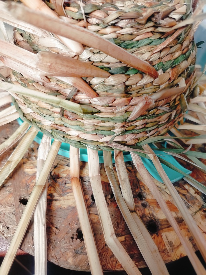 Набиваю стенки. Изделие немного подбалтывает, всё таки наступил на него. Пару стоек сломано. Постараюсь затянуть рогозом.