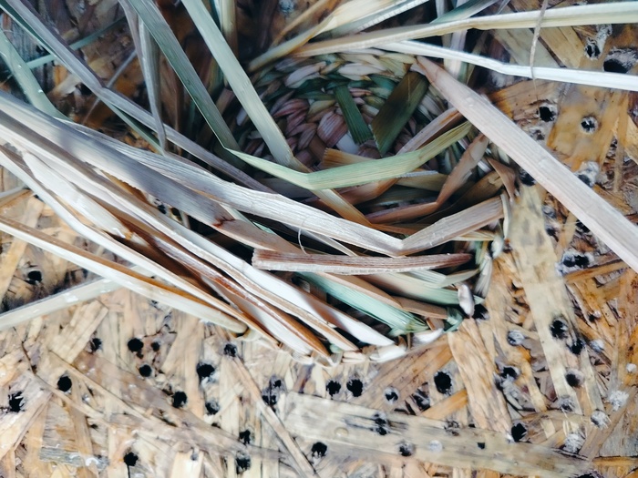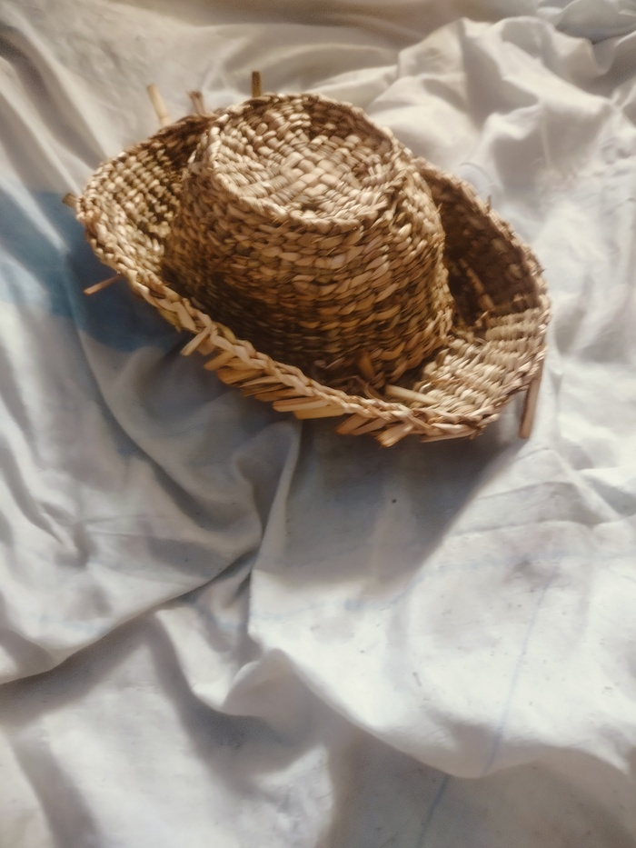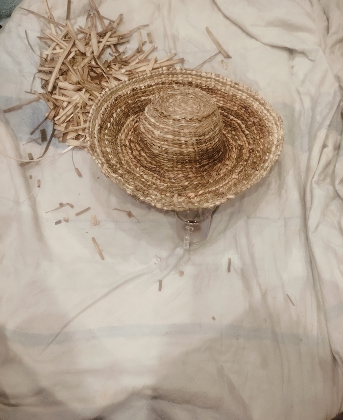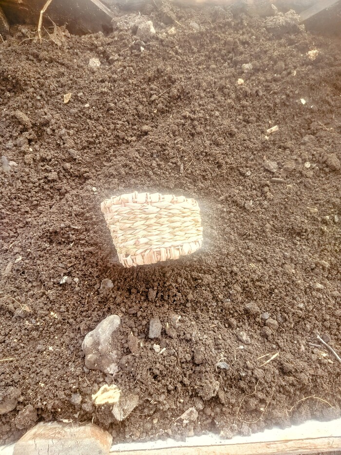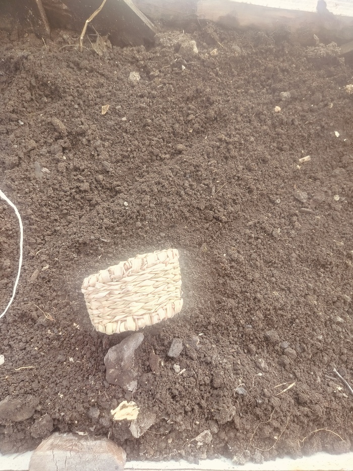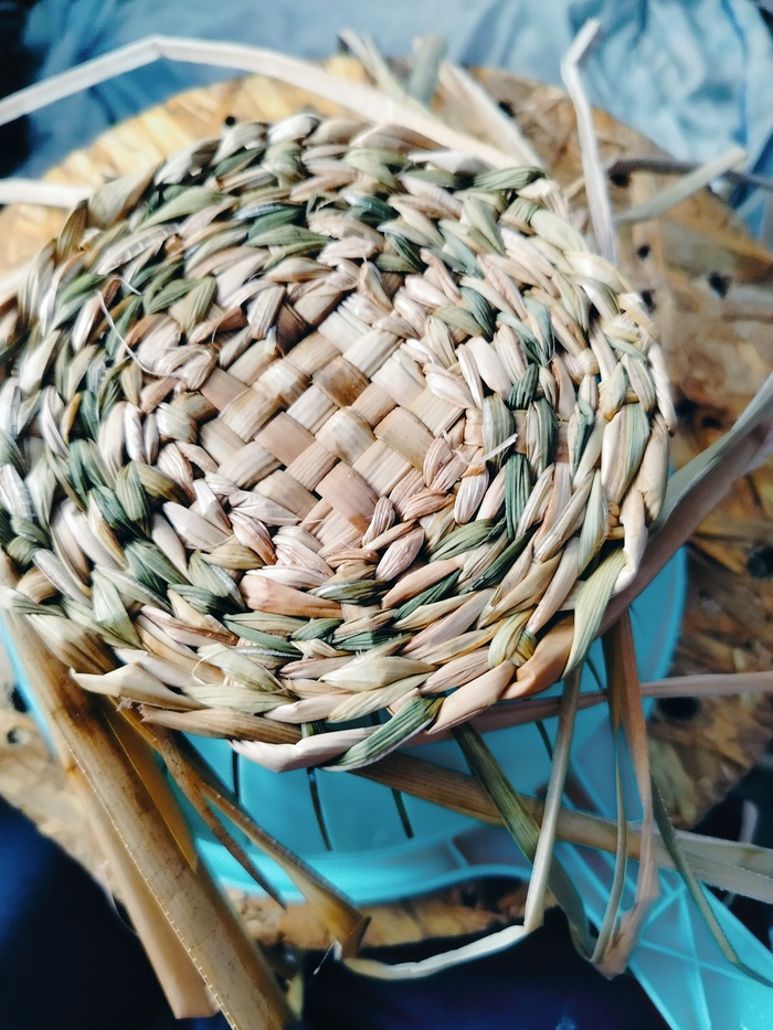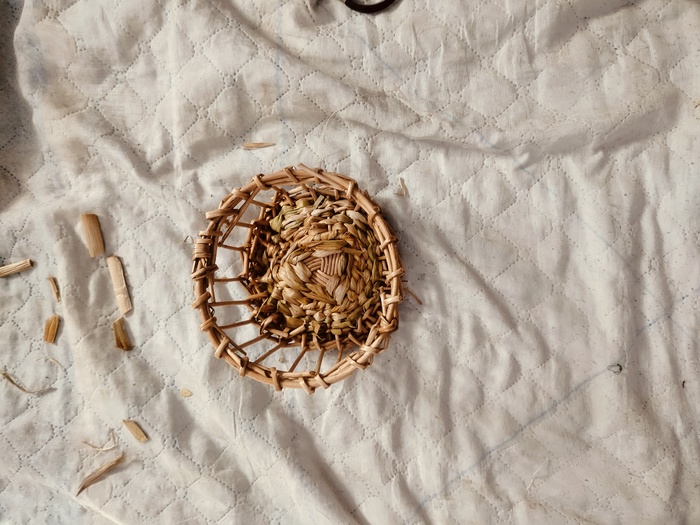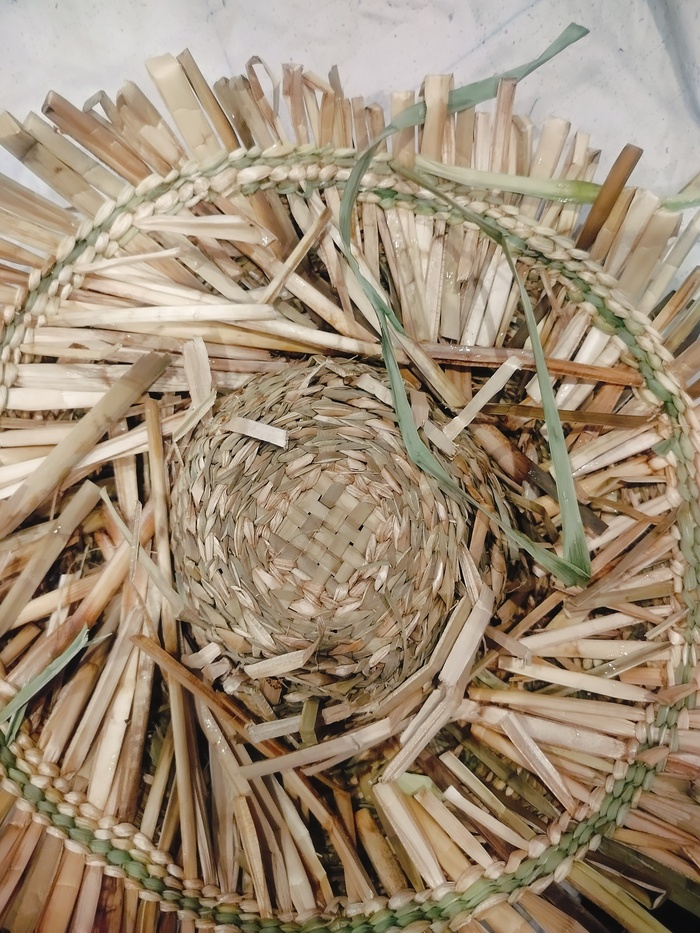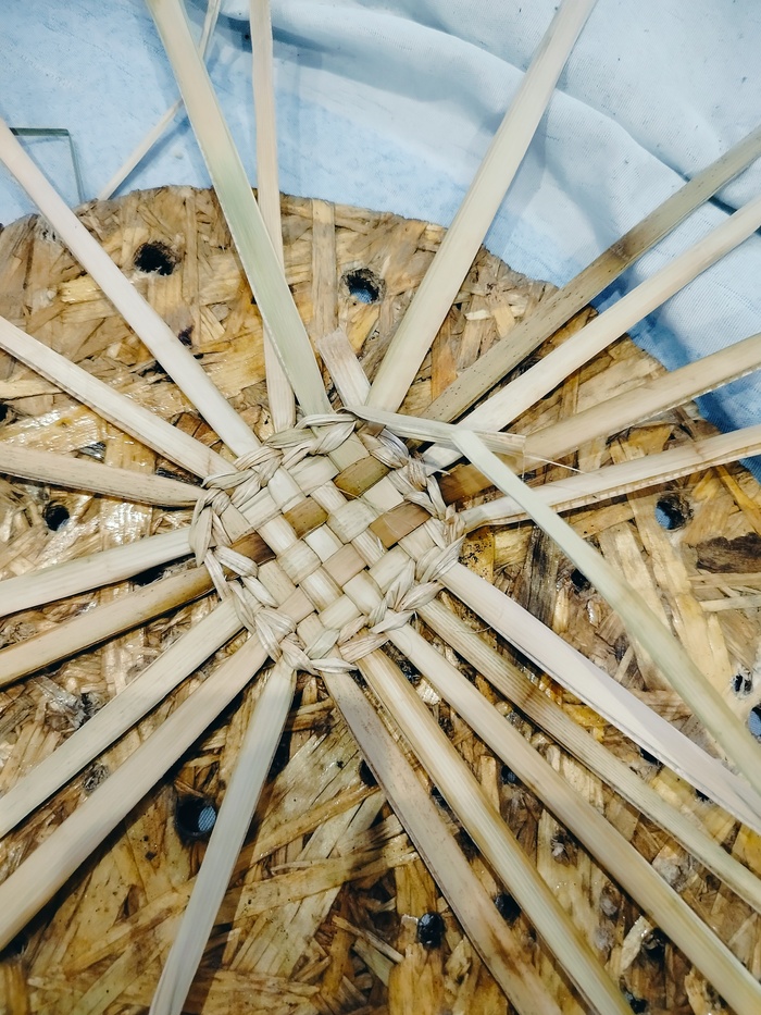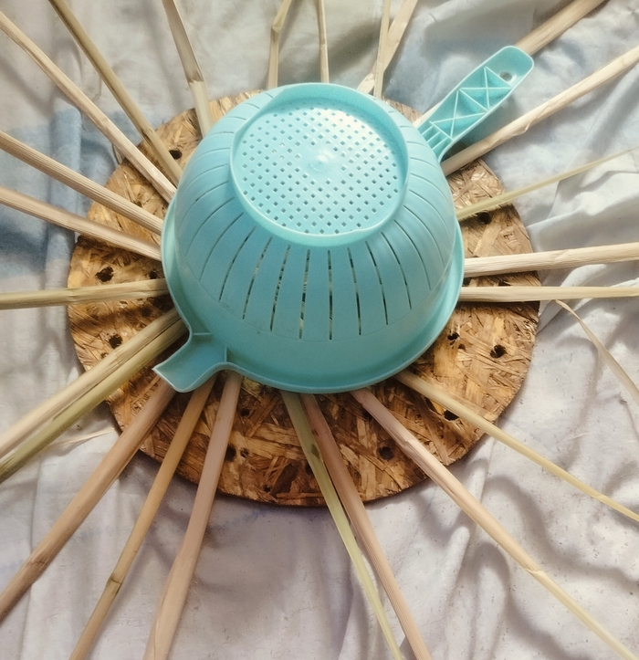 Набиваю стенки. Изделие немного подбалтывает, всё таки наступил на него. Пару стоек сломано. Постараюсь затянуть рогозом.