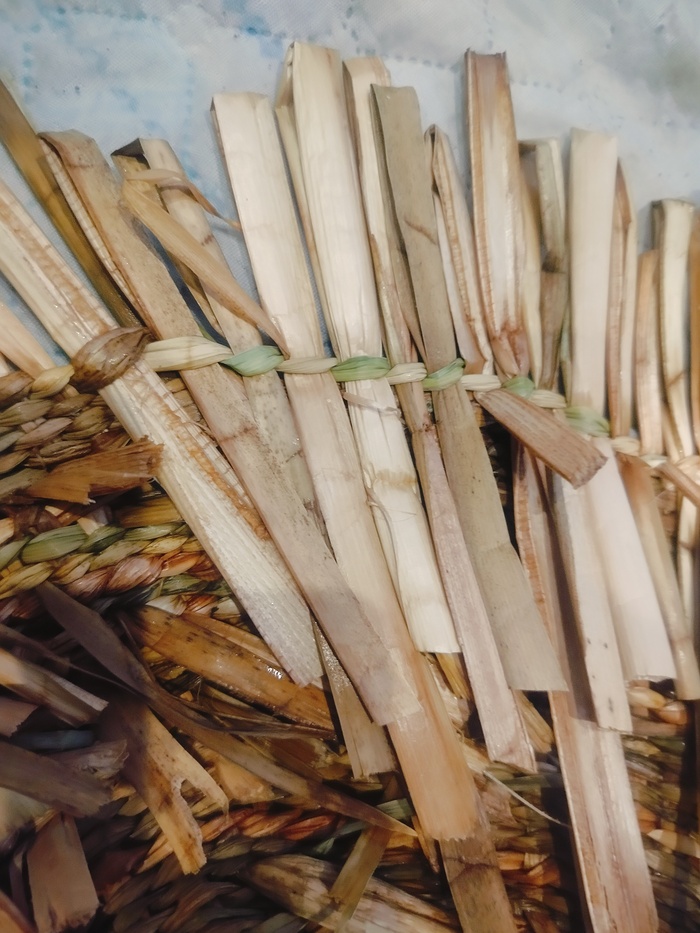 Всё очень просто и быстро. Заплетаем рогозом, верёвочку в два прута, либо «один через один»