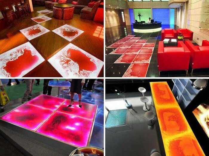 В настоящее время огромную популярность в дизайне интерьеров обретает живая плитка или интерактивная многослойная поверхность. Нижний слой производится из поликарбоната, являющийся экологически чистым и безопасным материалом. Средний слой – линза, состоящая из двухкомпонентной жидкости, а также красящее вещество. Верхний слой тоже изготавливается из полимерного пластика, но он намного сложнее и интереснее по своему строению, поэтому поверхность не скользит, не повреждается обувью на каблуках и шпильках.