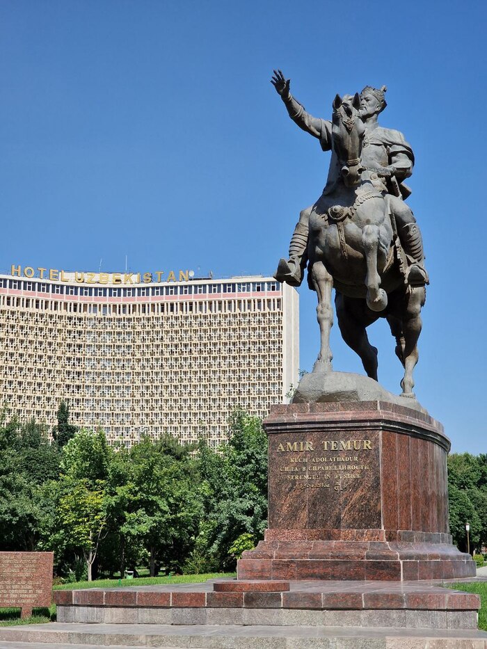 Ташкенту больше 2200 лет, но он младше своих братьев Бухары и Самарканда, которым по 2500-2800 лет. Тут проходил Великий Шелковый Путь и город захватывали многие разные народы и исторические личности. Говорят, здесь пил воду Александр Македонский из своего шлема, несколько капель упало на землю и тут выросло дерево. А вот статуя Амира Тимура, который приложил руку к падению Монголо-Татарского Ига.