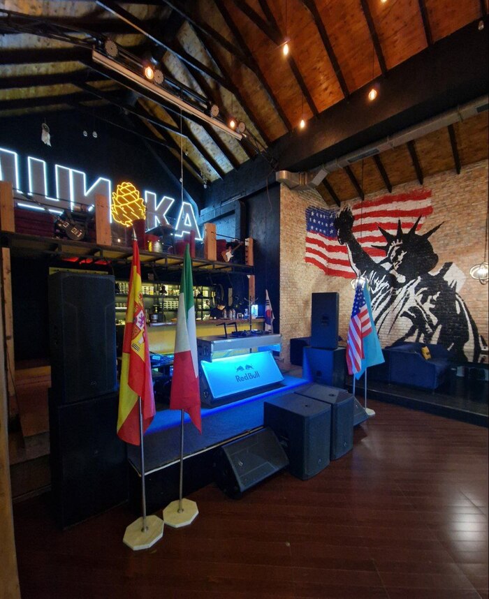 Сам интерьер кафе тоже обычный, европейского уровня, но странно было не обнаружить российского флага в этом ряду.