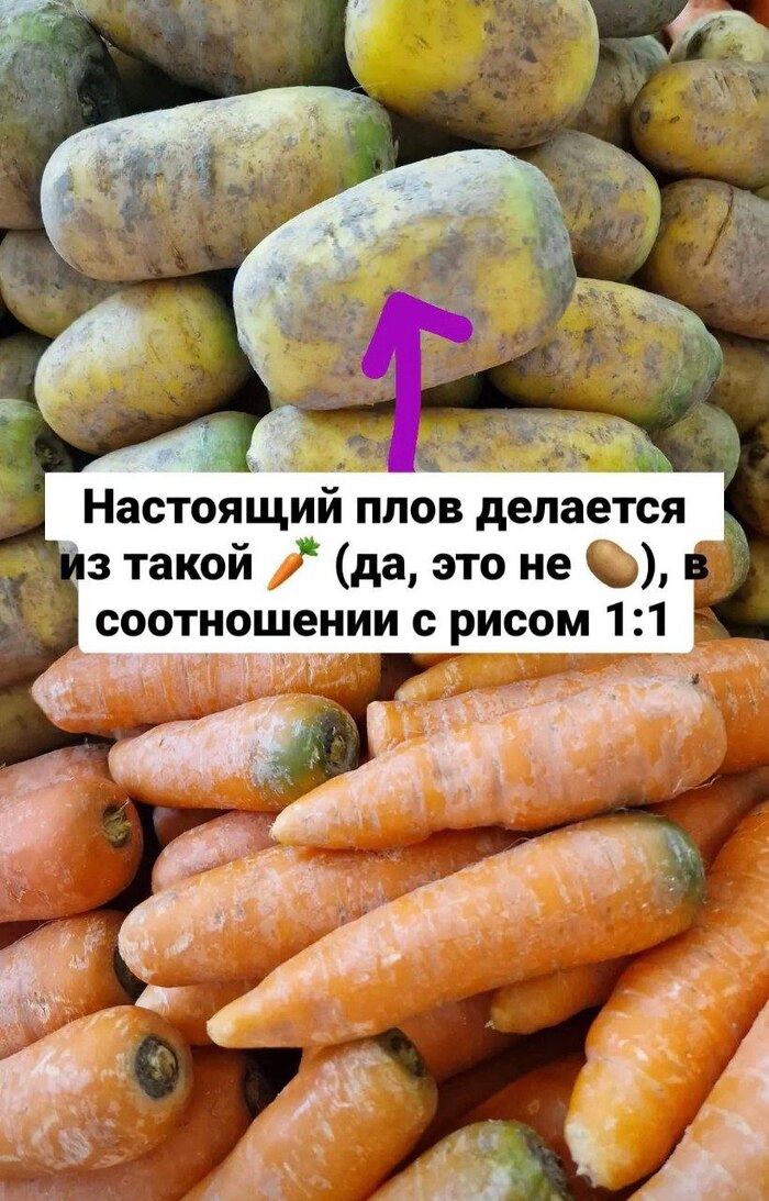 Для плова обычно используют желтую морковь, а не оранжевую. На фото она выглядит, как картошка, но это морковь. В плове ее обычно 1 к 1 с рисом.