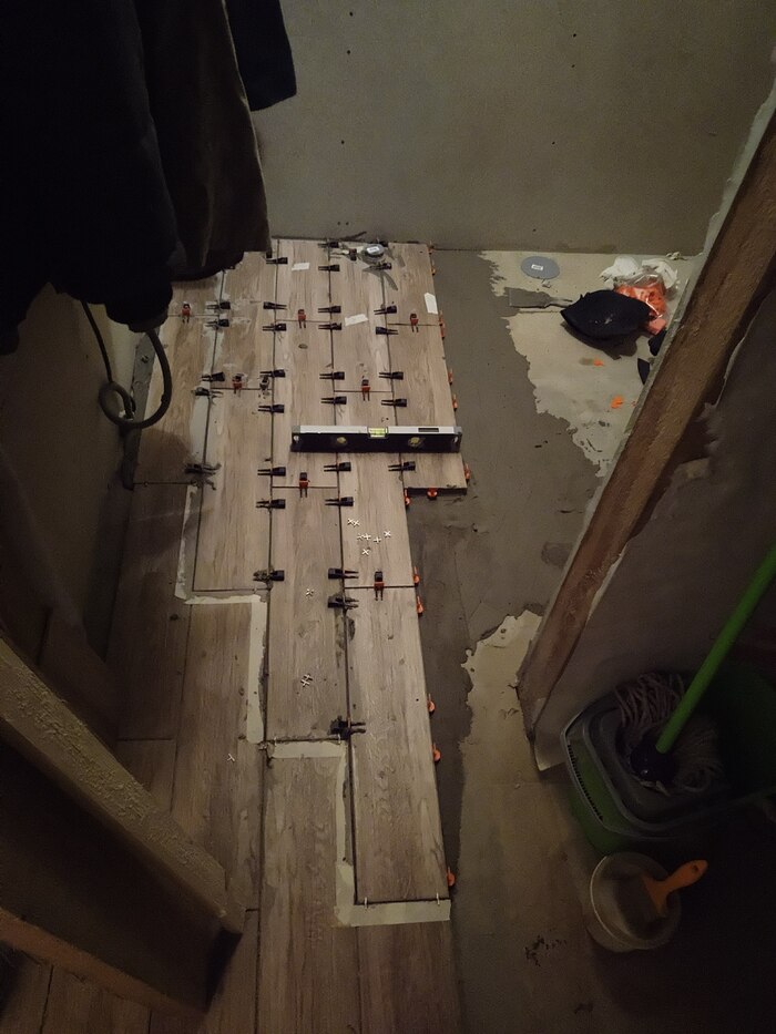 Когда всё это добро подсохло, я принялся и за плитку. Опять-таки приходилось укладывать кусками, иначе было не выбраться из помещения.