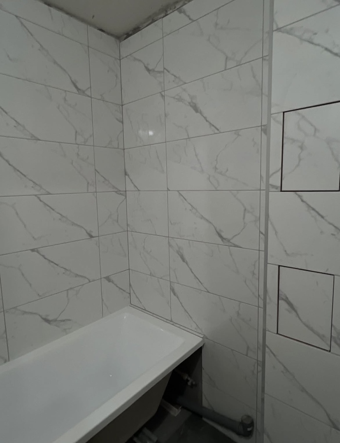 Для начала я счистил всю старую краску и побелку со стен. Затем сделал короб из влагостойкого гипсокартона с двумя ревизионными люками. В «мокрых зонах» сделал гидроизоляцию и установил ванну. Финал - укладка плитки.