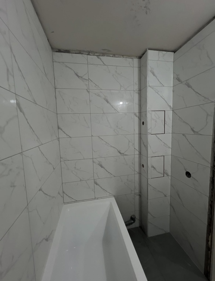 После гидроизоляции начинаю укладывать плитку в поддон.