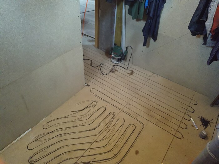 Уже весной, примерно в апреле я заканчивал плиточные работы - нужно было доложить плитку в санузле и тамбуре. В санузле тоже были задуманы тёплые полы, причём мне в голову, как обычно, пришла "гениальная" идея - сделать единый контур тёплых полов на санузел и коридор. Собственно решил я так сделать из экономии - чтобы не покупать ещё один терморегулятор, да и вообще возни поменьше. Кусок тёплого пола, выходящего в коридор, планировался, как что-то типа тепловой завесы от холодного тамбура, чтобы холодный воздух поменьше расхолаживал дом. По уму так делать нельзя, но я сделал 😁.
