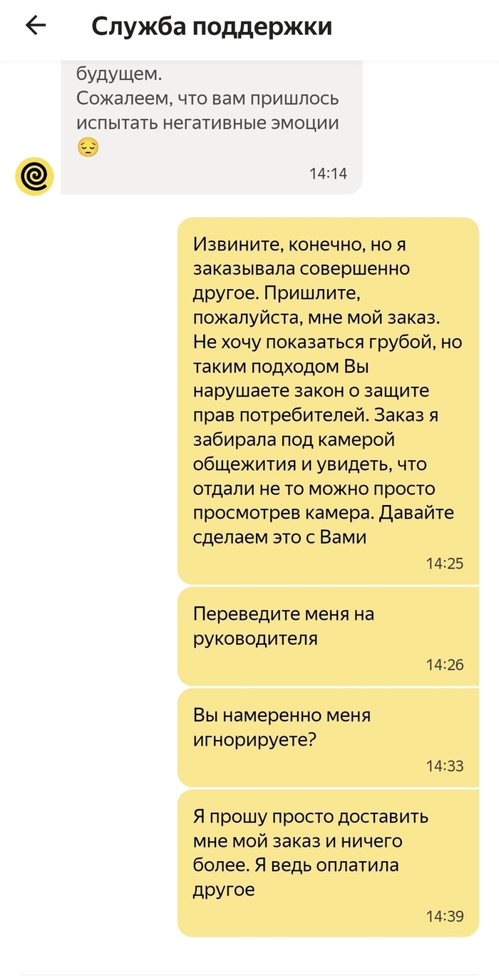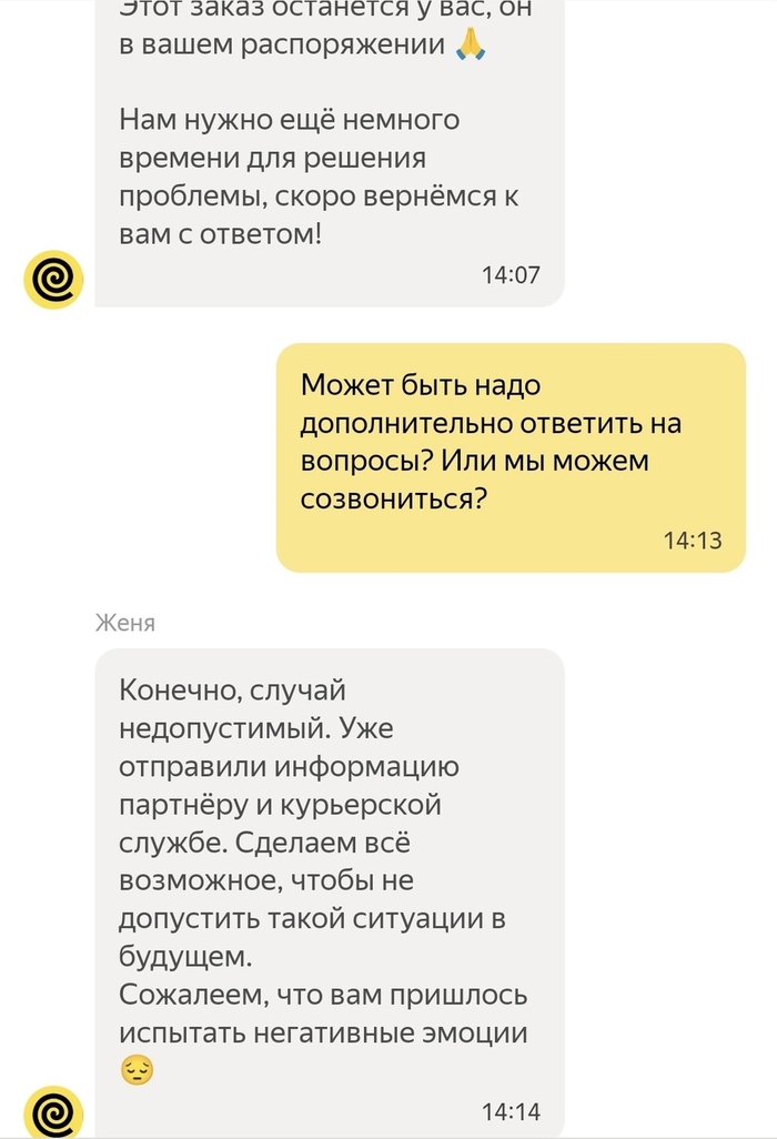 Ясно, что никакой курьер не вернулся, никаких денег за заказ мне не отдали и никто со мной больше не связывался. Яндекс еда считает лучшим решением проблемы - закинуть пользователя в игнор.