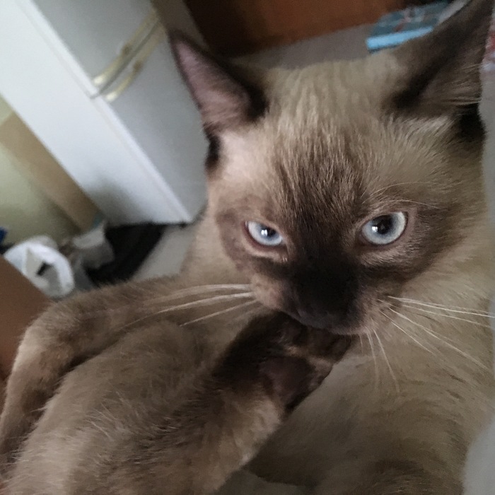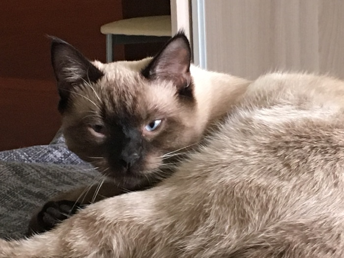 Зовут Кузей и через 2 недели ему исполнится 4 года. По утрам будит бодрым тыгдыком, ночью воет в ванной, умеет сидеть на плечах, как попугай и мявкает в ответ на любое обращение к его царственной персоне.