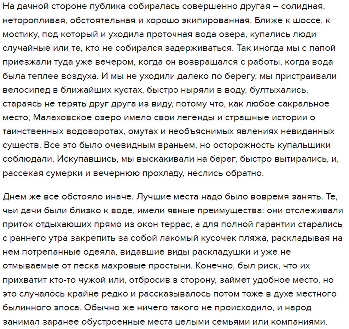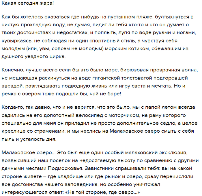Забыв про сказку, племянника как ветром сдуло. Я облегченно вздохнула и подумала, что сказочница из меня явно не выйдет, потому что все интересные сказки уже до меня давно придумали. И только сосед по пляжу, наверное, остался разочарованным, что ему так и не удалось узнать, чем же моя сказочная история закончилась или потому что мне все-таки удалось выкрутиться. Хорошо еще, что племянник маленький был, не понял, что к чему и не возмутился: «Это кто кому сказки-то рассказывает?!»