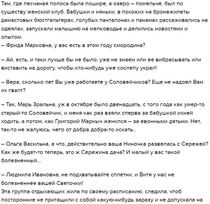 Но больше всего мне запомнился случай, когда моя мама купила мне лейку в виде розовой лупоглазой рыбы, и я целое утро поливала ею розы на клумбе. А тем временем она со своей знакомой решила позагорать. На пляж им идти было лень, погода была ветреная, поэтому они решили принять солнечные ванны в винограднике, который располагался за деревянной оградой сразу за нашими домиками. Там еще кто-то до них уже протоптал тропинку к винограднику и сделал дырку в заборе. Закончив поливать цветы, я решила к ним присоединиться, а в то же время мамина знакомая рассказывала историю про мужчину, который решил позагорать на пляже, расположился там поудобнее, разделся, снял часы и кольцо, чтобы незагорелых мест на руке не осталось, включил радио и заснул под музыку. Проснулся он от ощущения, что по нем что-то такое скользкое ползёт. Мужик быстро подорвался и убежал с пляжа, а через время понял, что он оставил там свои вещи и вернулся на пляж. Подошел к своему покрывалу, а там ни его одежды, ни часов с кольцом, ни радио не оказалось. Вообще в той истории было много непонятного, то ли он змею во сне увидел, то ли ему что-то показалось или кто-то все это специально подстроил с целью обокрасть. Затем они принялись обсуждать тот факт, что в местных виноградниках тоже могут водиться змеи.