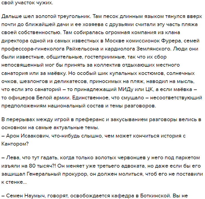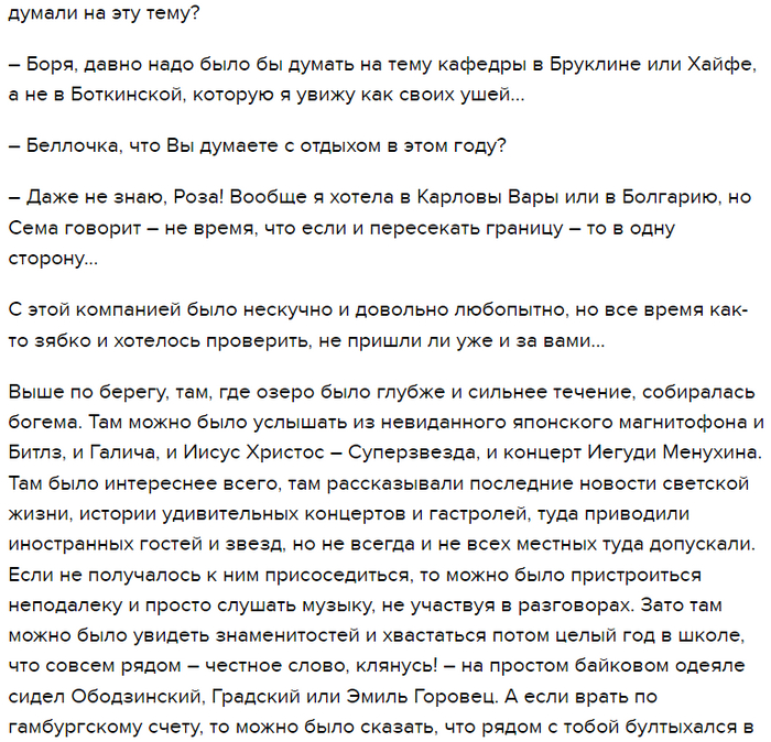 Говоря об отдыхе с соседями, я не имею в виду соседей по даче или по подъезду, а просто соседей по пляжу или людей, живущих в соседних странах. Напоминаю, что это было давно, когда все жили тихо и мирно. Так вот, лежу я как-то на пляже, читаю книжку и наблюдаю такую картину. По соседству со мной расположилась группа мужчин, человек пять или шесть амбалов с пивными животиками, которые громко гоготали и играли в карты. Где-то в полдень к ним подтянулись их дамы, которые принесли с собой тяжело нагруженные сумки. Одна из них стала громко возмущаться: «Вместо того, чтобы загорать, мы целое утро готовили вам обед. Вот посмотрите на этого русского, он жареный пирожок на пляже купил, съел и доволен, а вам бы только жрать и жрать — и первое подавай, и второе, и третье». Тут она махнула в сторону парня, о котором она говорила.