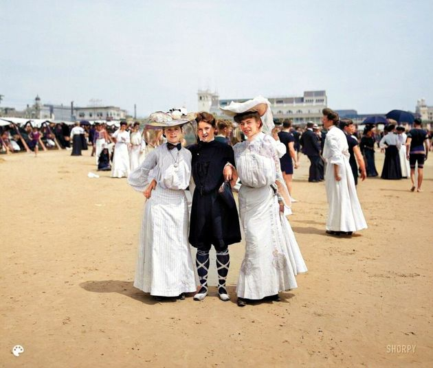Первое, что бросается в глаза это купальные платья у девушек. В 1905 году купальные платья по колено и без корсетов считалось -обнажением на грани приличия.