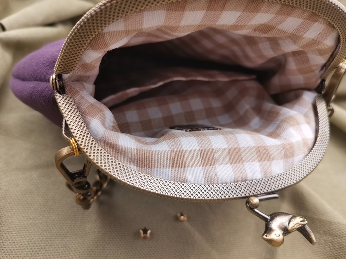 Размер сумки 19х22 см. Объем сбоку 4 см. Внутри клетчатая ткань и небольшой кармашек