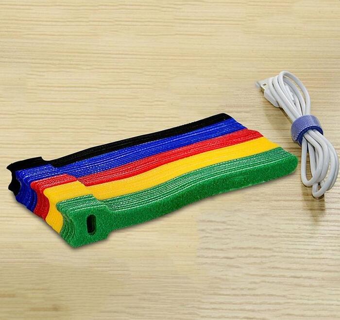 Если не хочется возиться с нарезанием кусочков из длинных полосок ленты-липучки из предыдущей карточки, рекомендую присмотрется к данному наборчику. В нем идет сразу 50 кабельных хомутов пяти разных цветов, с помощью которых можно также легко организовать порядок на рабочем месте. Ленты оборачиваются вокруг проводов, а хвостик продевается через овальное отверстие надежно их фиксируя. Длина каждой стяжки 15см, а ширина 1.5см.