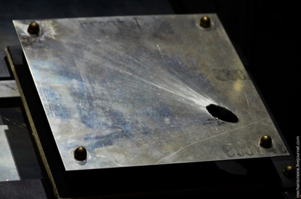 А это защита с российского модуля МКС «Звезда», пробитая алюминиевым болтом на скорости 6800 м/с.