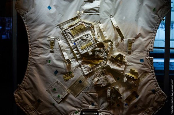 А это брезент для закрытия стыковочных люков между станциями во время строительства. Брезент провисел в одном из люков международной станции почти два года. Он состоит из многочисленных слоев стекловолокна, керамики, стекла и сверхпрочных волокон стали. Заплатки предназначены для коммуникаций при строительстве, а синие и зеленые наклейки — это попадания мелких камушков и мусора, обнаруженные после того, как брезент вернулся на землю.