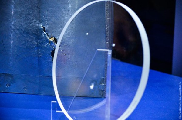Иллюминаторам тоже достаётся. Толщина стекла 14 мм, такие трещинки остаются в нем при попадании песчинок на скорости 7152 м/с. Кстати, на станции иллюминаторы состоят из четырех таких стёкол, для полной защиты, а то мало ли. На заднем плане видна обратная сторона 102-мм алюминиевого блока, показанного выше.